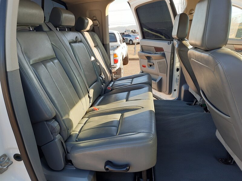 This Ram 1500 Mega Cab pairs the 5.7L HEMI V8 with a five-speed automatic transmission and the Mega Cab body, offering the long-legroom rear passenger area and four full-size doors. The HEMI 5.7L produces 345 horsepower and 375 lb-ft of torque and includes Chrysler’s Multi-Displacement System (MDS) to improve fuel economy under light load by deactivating four cylinders when appropriate.