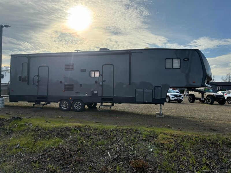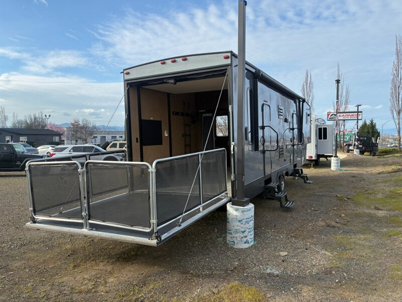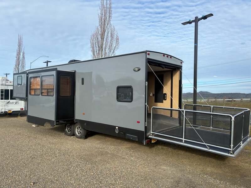 - Reinforced chassis and frame designed for toy-hauler use, with heavy-duty axles and suspension components rated for cargo in the garage area.