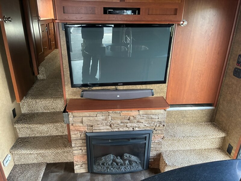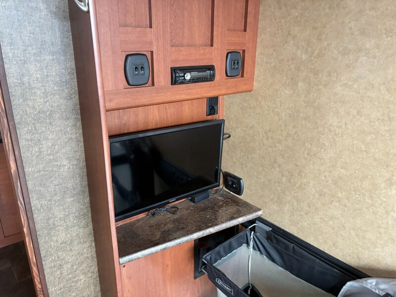 - Entertainment center with TV hookup, stereo receiver, interior speakers, and storage for media components.
