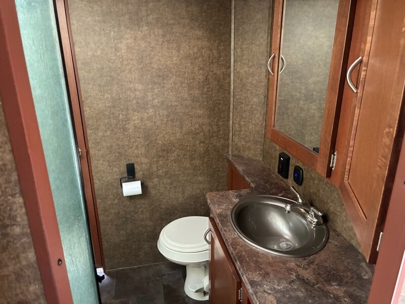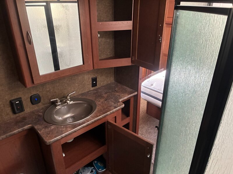 - Full bathroom with shower (often a fiberglass surround or acrylic pan), skylight or skylight vent above the shower on many models, vanity with sink and mirror, and a residential-style or RV porcelain toilet.