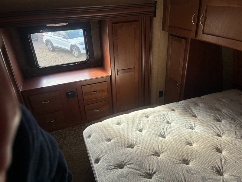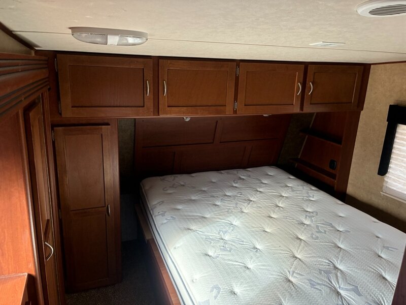- Front bedroom with a factory-installed mattress (queen or king depending on model), mattress platform, and wardrobe storage.