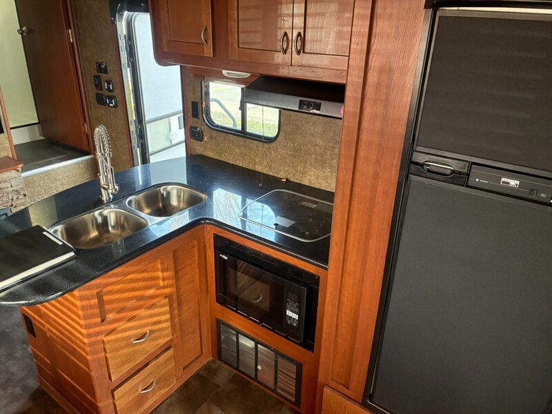 - Laminate or wood-finish cabinetry with factory-stained cabinet doors and drawers, and solid-surface or laminate countertops in kitchen and entertainment areas.