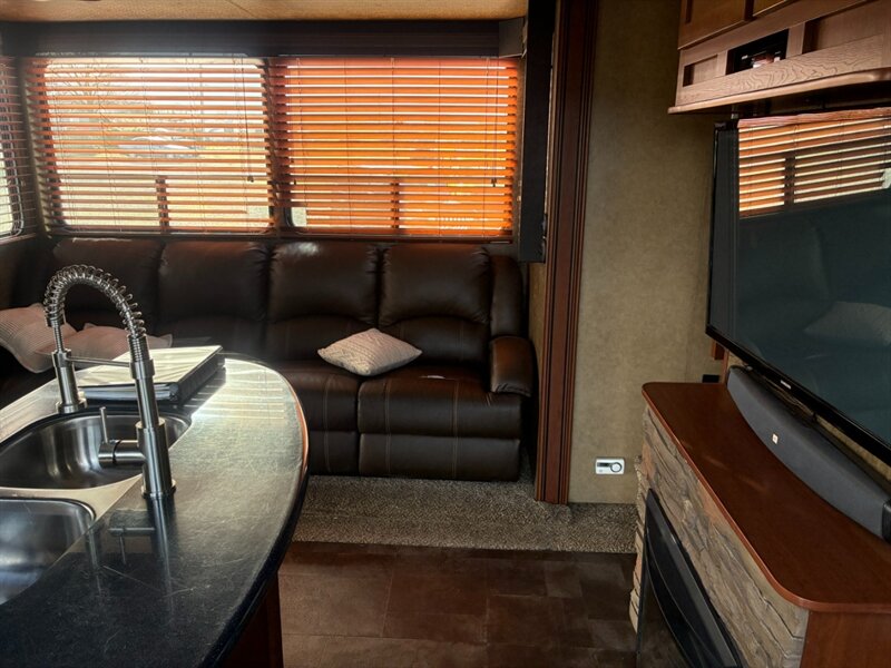 - Main living area with a combination of sofa or theater seating and a dinette; some floorplans include a tri-fold sofa or reclining theater seating.